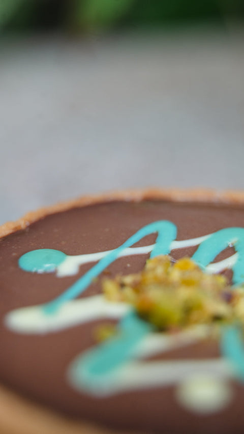 A decadent fusion of Middle Eastern tradition and modern patisserie. Our Pistachio Kunafa Tart features a made-from-scratch pistachio praline, crafted from roasted pistachio nuts and caramelised sugar. It’s layered with a toasted butter kunafa mix for crunch and texture, followed by a silky Callebaut dark chocolate delice. Everything rests on a buttery shortcrust pastry base, delivering a luxurious bite in every slice.